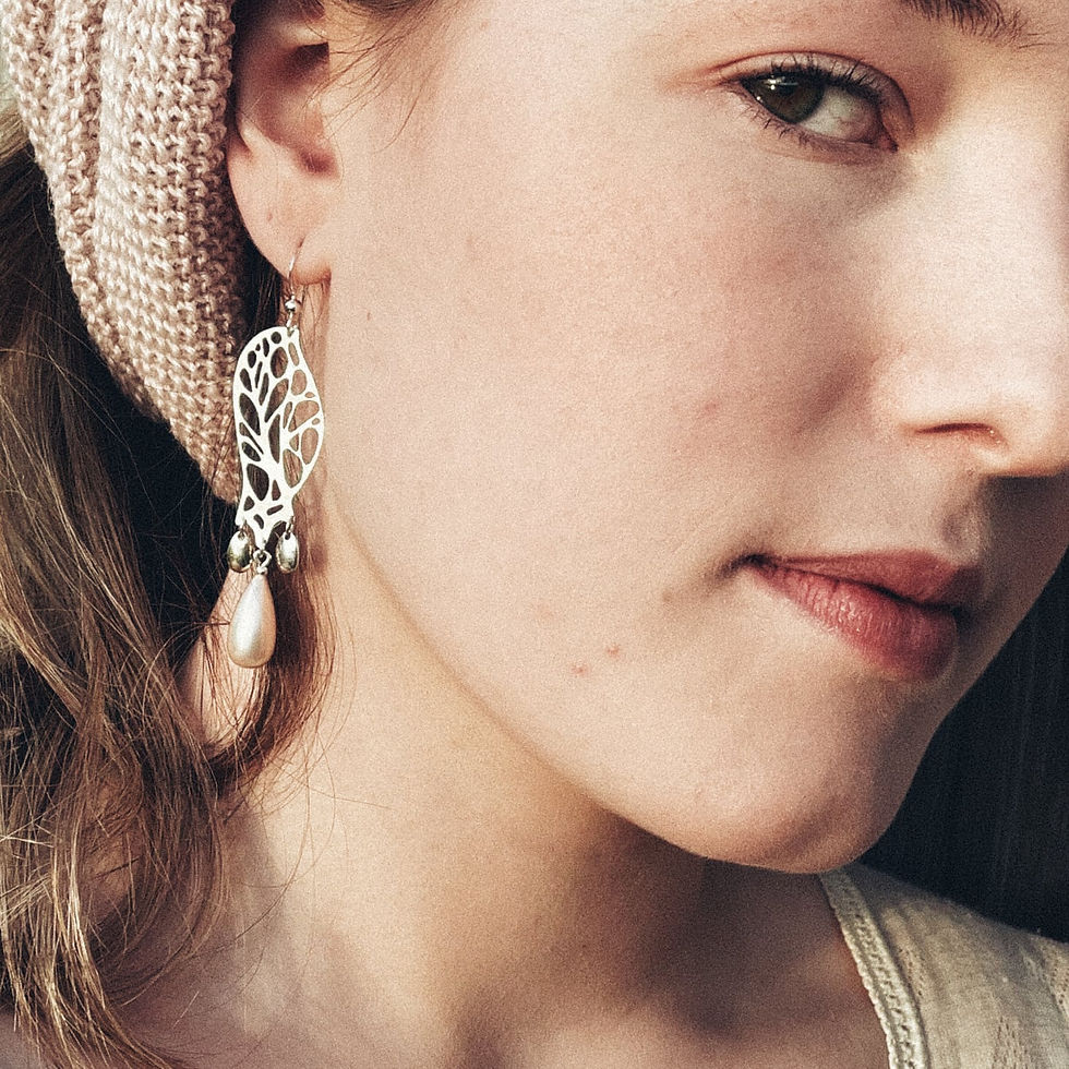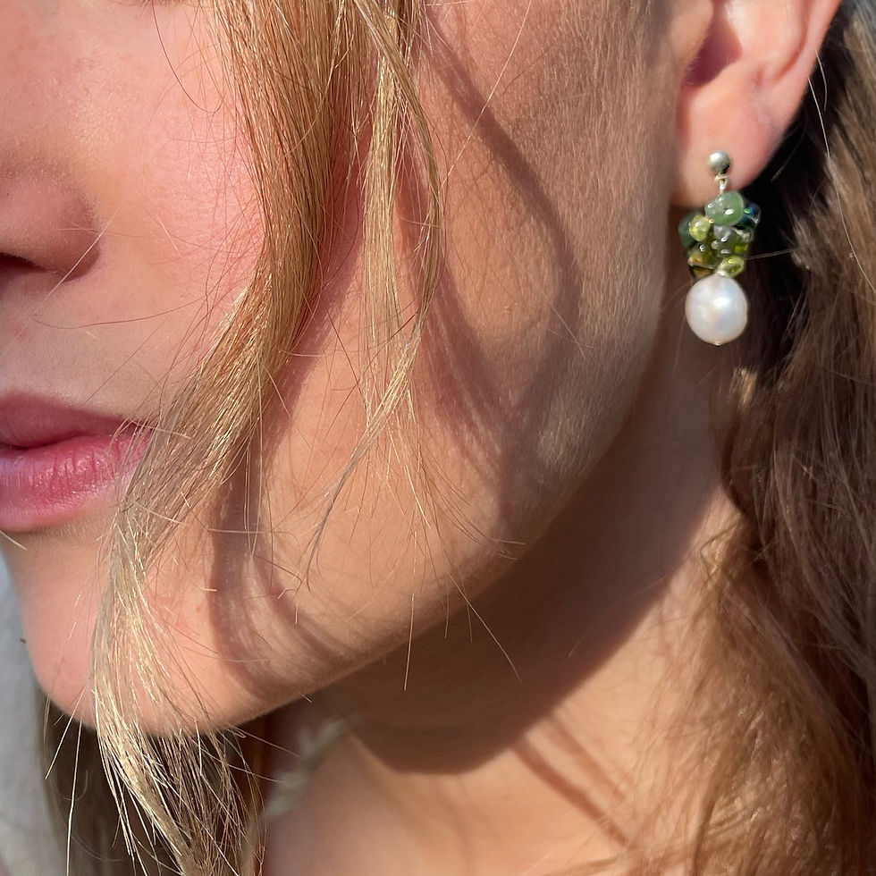 Øredobbene merket håndlaget er er laget i ulike materiale med strukturer og former inspirert av naturen. Kombinasjonen med steiner og perler gir øredobbene en diskré eleganse som blir lagt merke til. Hvert par er unikt og finnes bare i et eksemplar.
